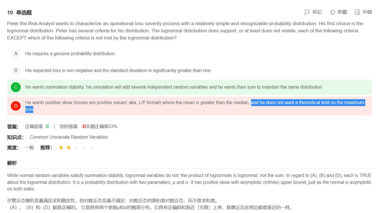 既然对数正态分布是右偏的,不就说明在理论图形上不可能出现负数吗?那为什么D选项后半句话是对的?