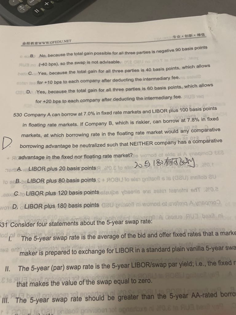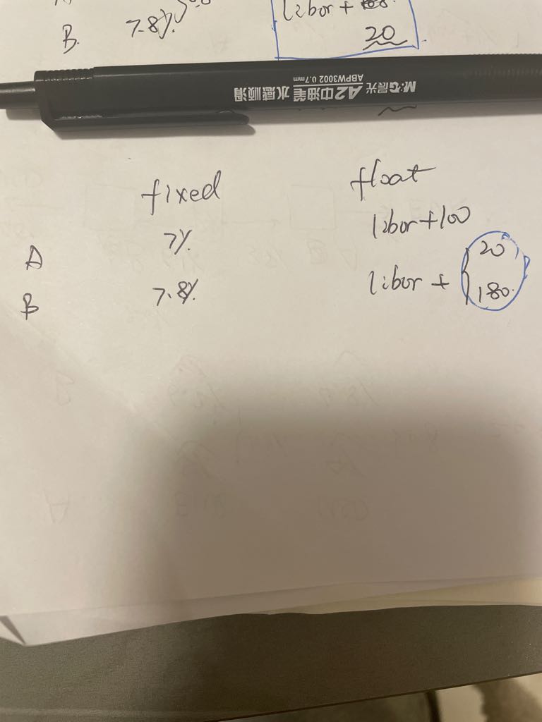 请问老师,为何每次教材跟题目里的两个公司总是有一家具有两方面绝对优势。如果不是会怎么样?比如我这个图里,A在固定上比B少0.8%,在float上如果比A正好便宜0.8%或者多了0.8%