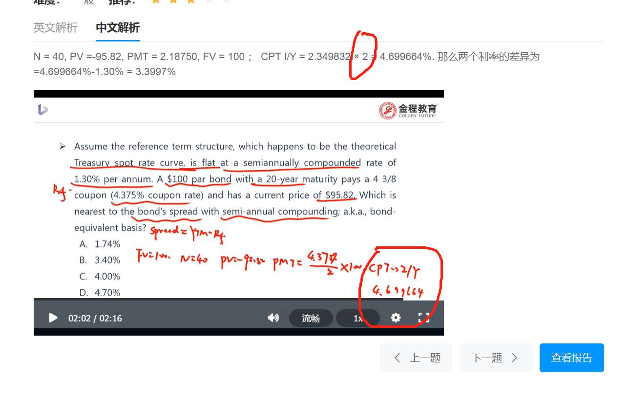 由图:问题1:讲解中老师说明CPT→I/Y可直接算出4.699与解析不符合,我摁出来和解析一致:是2.3498 问题2:解析中说明要乘以2,但是N=40代表的是40期每期付利即半年付利2.3498,本题正要求半年付利下的利差,我认为是2.3498-1.3=1.0498,即使计算器算出来的2.3498是年付利那也应该除以2得到半年付利的结果,我认为解析中乘以2是有问题的!