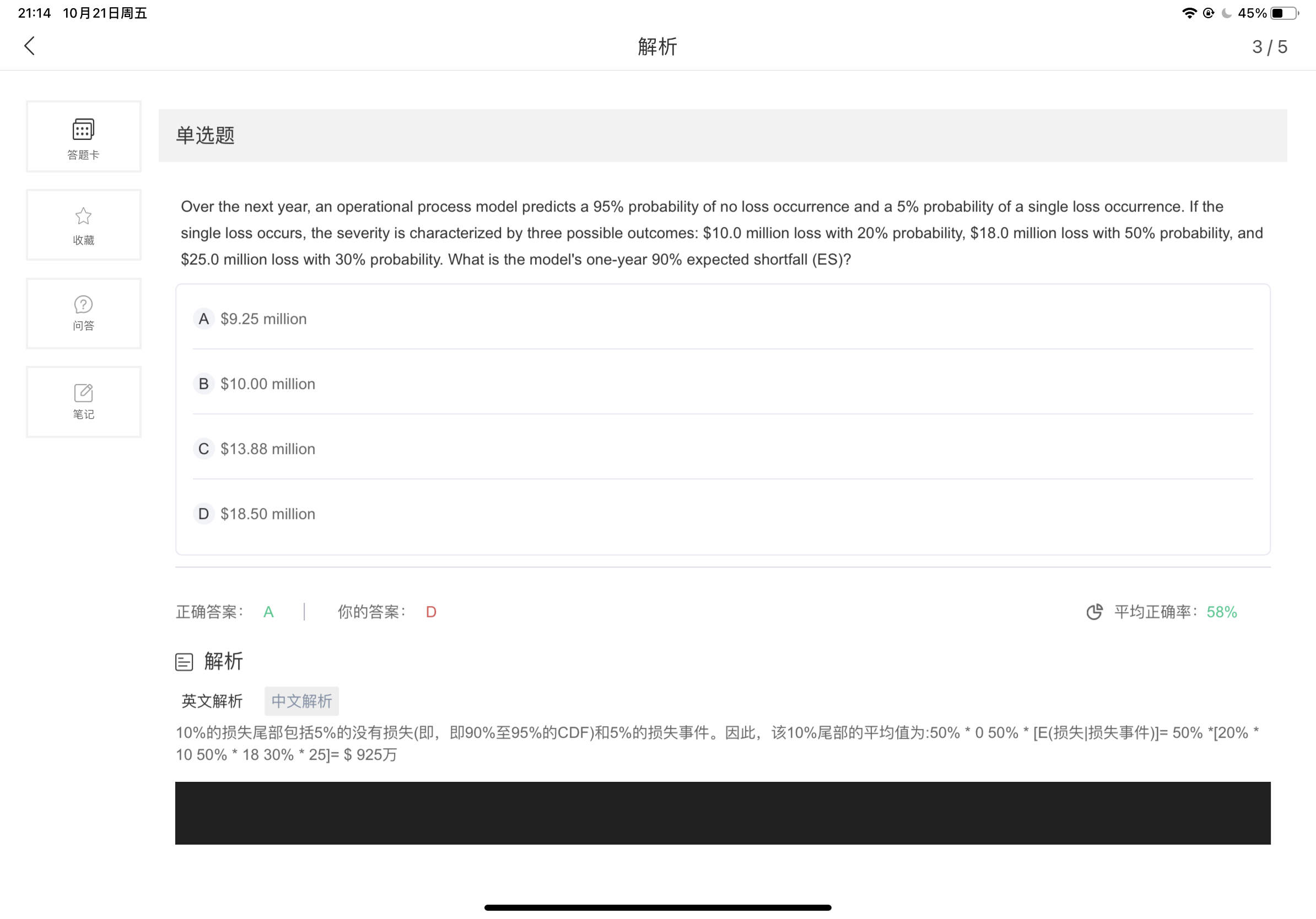 专场人数:3414提问数量:63382请问老师一般我们给了一个置信水平不就说明置信水平的左侧全部都是损失嘛?怎么还可以一定比率是损失一定比率是0的情况呢?这是什么意思呢?不太明白为什么可以给一个置信水平还给一个损失的占比…