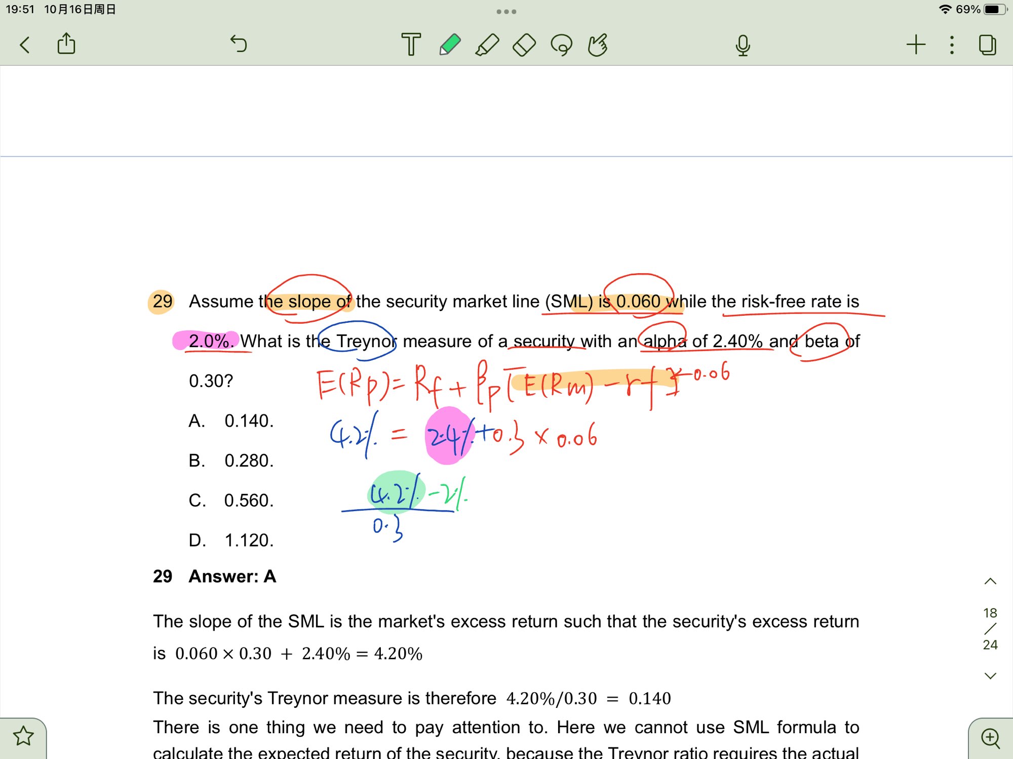 老师这个题有两个地方不太懂第一是为什么无风险利率不是百分之二,其次为什么黄色笔哪里不减一个无风险利率年,按着TR公式分子应该是组合收益率减去无风险利率啊