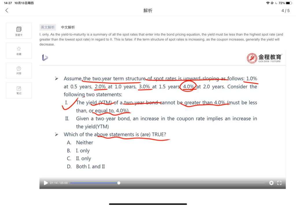请问这道题I中 两年期的ytm怎么可以等于4%呢?upward slopping的term structure的图中ytm一直是在spot curve 下面 如果都是两年期的为什么会出现相等呢?