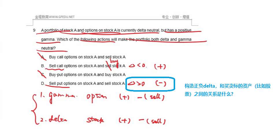 第九题,构造负的delta,要卖出标的资产。买卖标的资产和delta的正负之间什么关系?