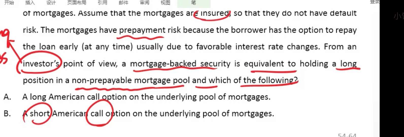 老师,1.上面题目说mortgages有提前偿付的风险,然后问题又是投资者会持有一个没有提前偿付的pool,这是矛盾了吗?2.为什么可以分析出来投资者会给发行人一个提前赎回的权利呢