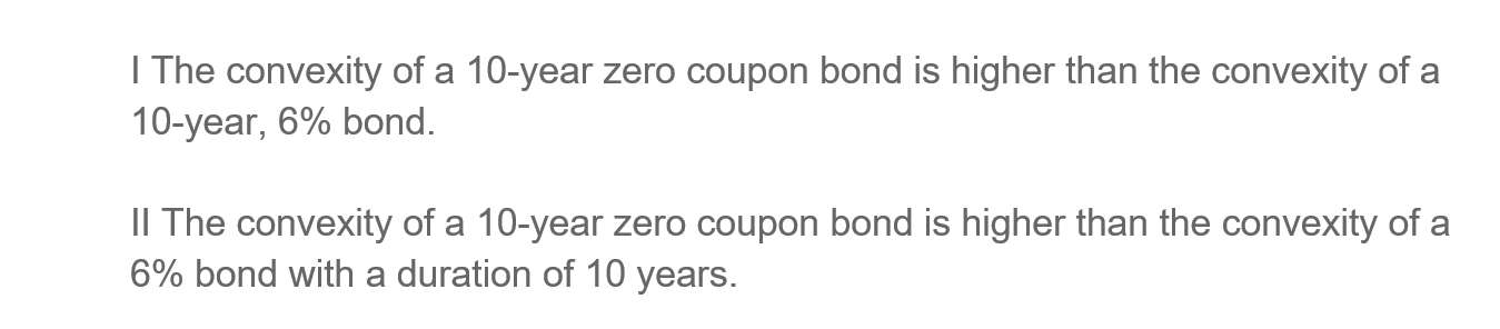 第一个:The convexity of a 10-year zero coupon bond is higher than the convexity of a 10-year, 6% bond.第二个:The convexity of a 10-year zero coupon bond is higher than the convexity of a 6% bond with a duration of 10 years.