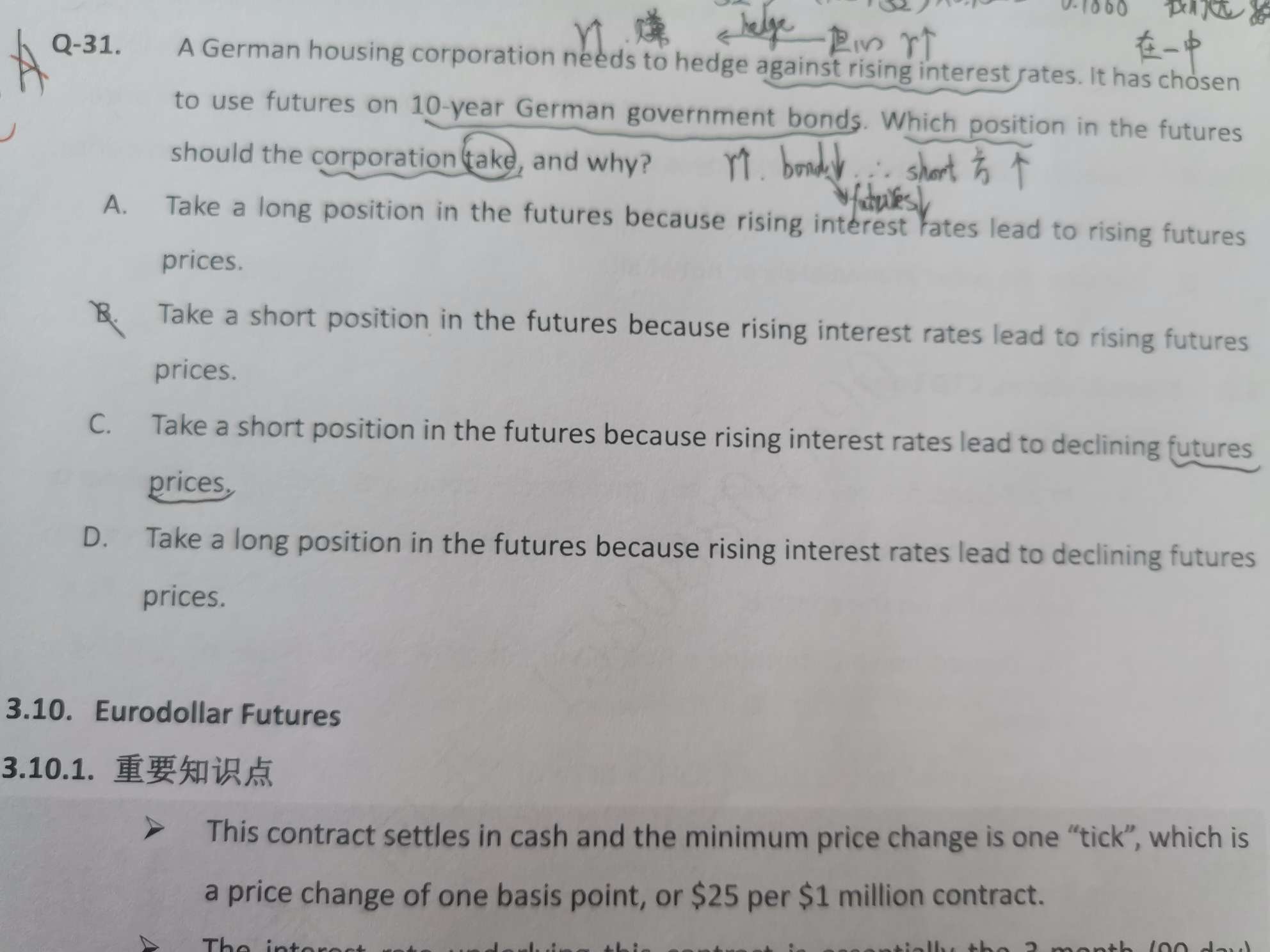 利率上升,债券价格下跌。传导到futures,不是要看futures的方向吗?如果是long futures就是价格下跌,如果是short futures就是价格上涨。选项中描述的futures price到底是什么?如果是long futures,这不是应该下跌吗?Short futures这个价格不应该是上涨吗?