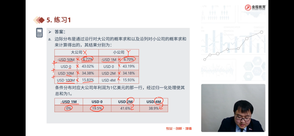 挺好笑的,这老师一直讲题讲不到点上,和前面讲的很多题一样,她讲的不能说错,但就是很烂。选项a, 你看看题里的表述,must be,你看的这个说法不会觉得,这道题是概念判断不是让你一个个计算吗。Arithmetic Mean(算术平均) ≥ Geometric Mean(几何平均),且只有当所有数完全相等时才会等号成立。你大概一看就能看到这些百分比加起来 = 65%,65% / 5 = 13%,所以13%是算数均值。考试的时候根本不用专门为选项a按计算器。她前面讲的题也是,不能说错,计算也是对的,就是云里雾里,自己想当然的讲。
