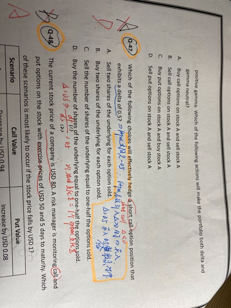 47题,为什么D那么解释呢?delta=0.5,表示stock price的变化量是option price变化量的2倍不是吗,那和数量0.5份又有什么关系呢?