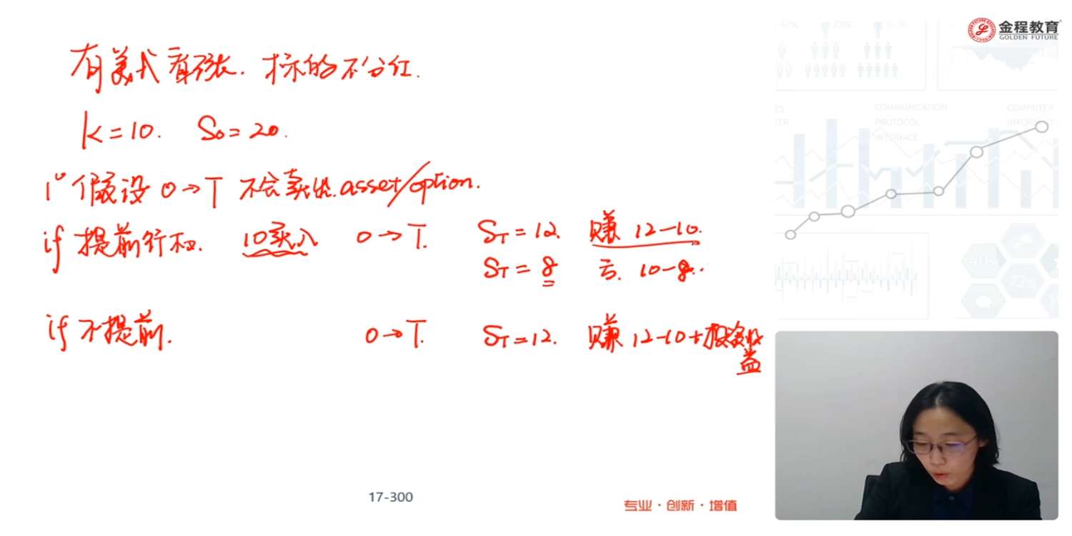 老师,这儿没太听懂,不是第一种是提前行权么,应该是在T之前行权,这里的假设ST=12不是T时刻的价格么,第二种不提前行权的价格ST=12的假设和第一种T时刻之前的价格一样是不是比较特殊的情况?我的意思是,提前行权和不提前行权的ST都是一样的么
