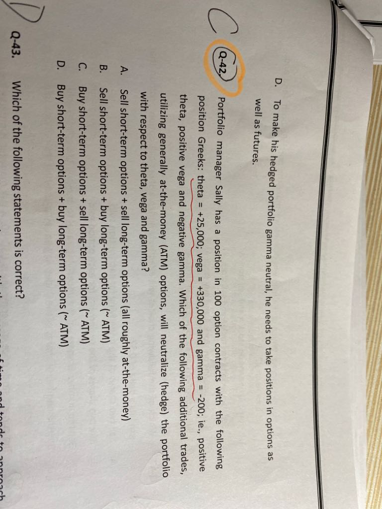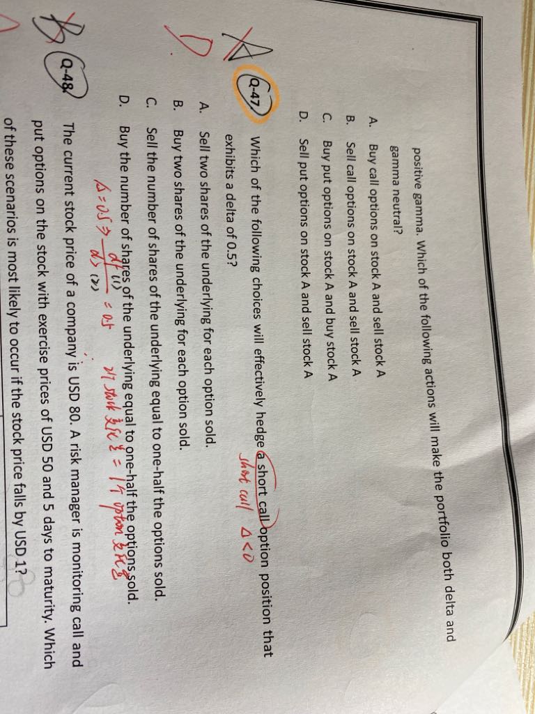 1.47题为什么选D?为什么delta是0.5,shares就是option数量的0.5倍呢?2.已经是short call,题目中delta为什么还是0.5而不是-0.5呢?