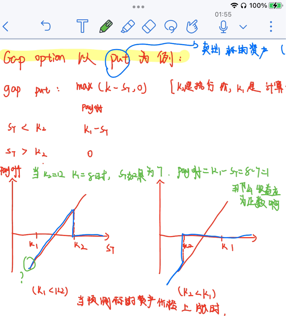 老师我想问一下,看图中绿色文字。如果当K1为8,St是7时,payoff 应该就是正数了啊?那为什么图像一直是向下的趋势呢?还有就是想问一下这个payoff 是指什么给我带来的收益呢?是期权的么?