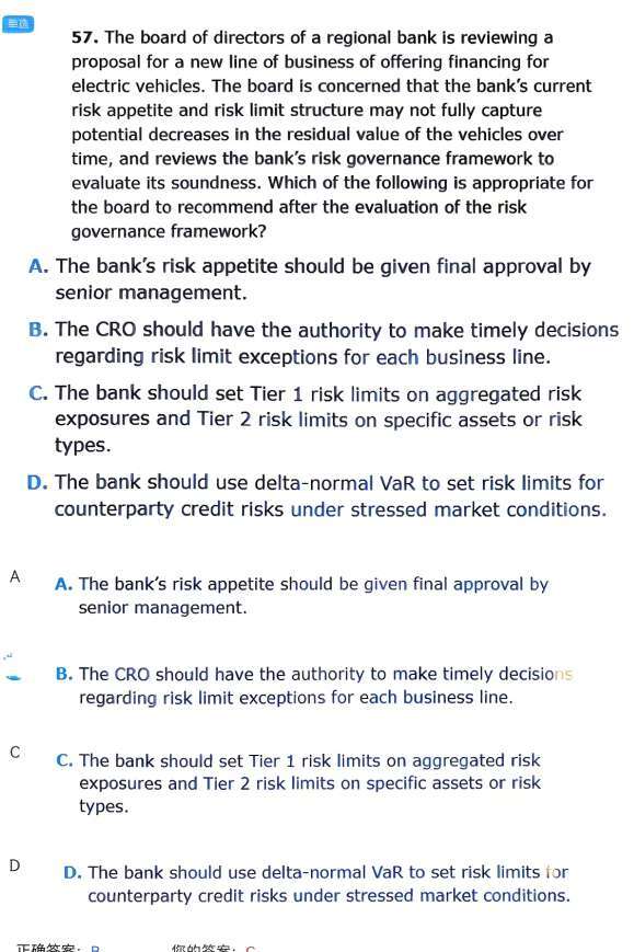 我的疑惑是,B好像没有权利去make a decision吧,他不是仅仅提一个看法,然后最终拍板的还是board啊 C我记得risk limit的第一个是战略,就是总体风险,lier2就是各自的风险的