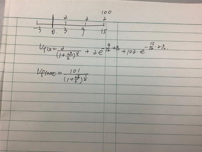 已回答The LIBOR curve isflat at 2.0% per annum with continuous compounding for all maturities (out to 15 months), including the six-month LIBOR at the last payment datewas also 2.0% (but with semiannual compounding). 这句话的意思不应该是在—0·25到0.25那一期,应该按照半年利折现吗就是应该是如图