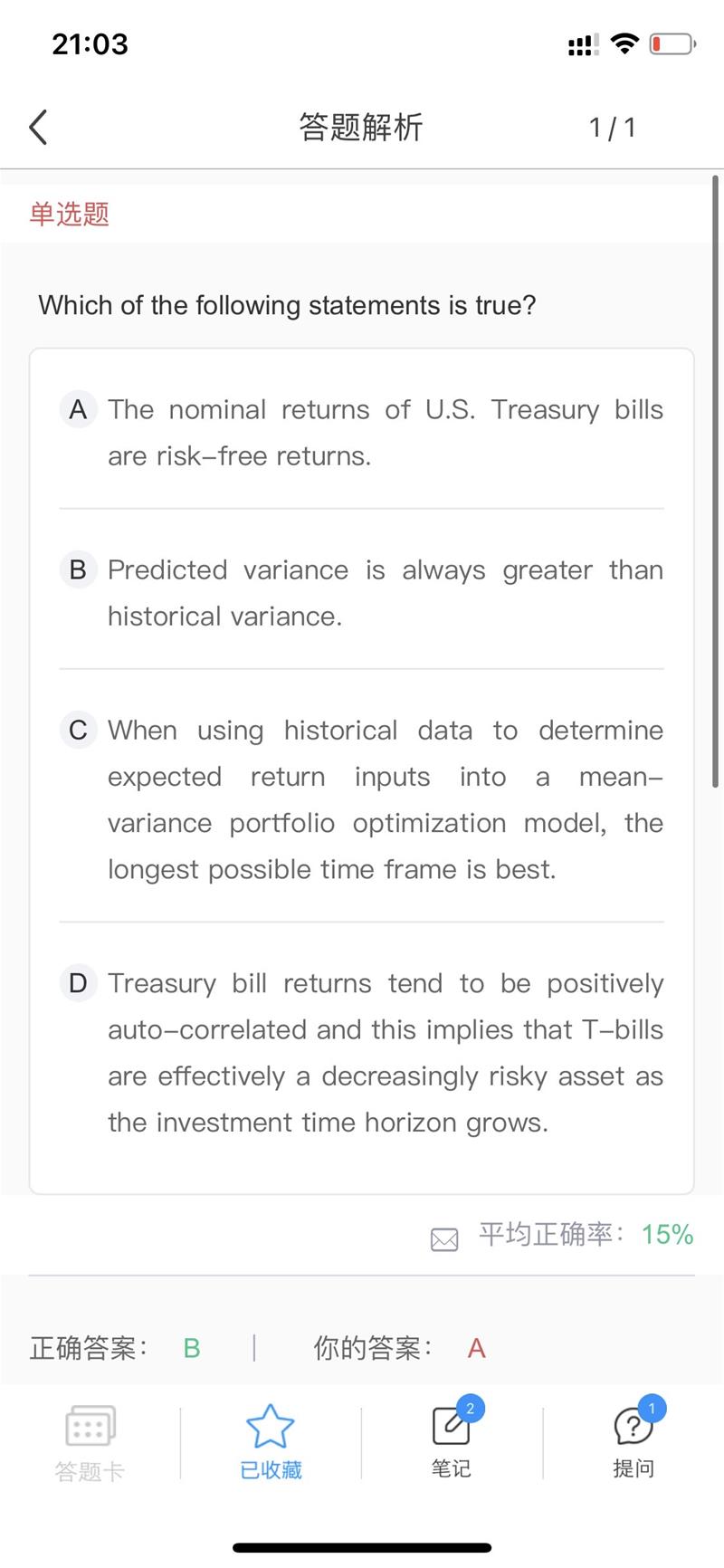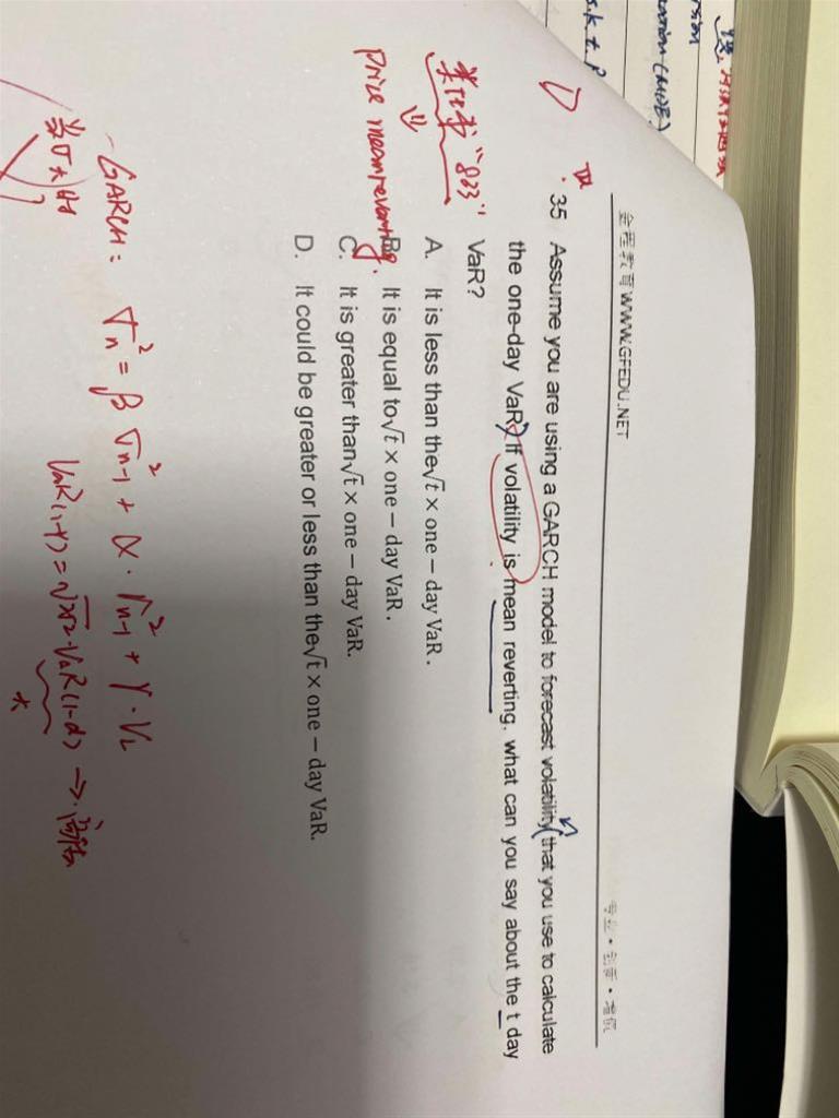 专场人数:3393提问数量:63230请问第三张图片的选项B说历史数据推算容易高估波动率,第二张图里的这道题说,波动率在有负归时,计算的VaR,有时大有时小。这两个说法矛盾吗? 第一张图说如果价格负归,VaR值偏小。这三种说法有什么联系吗?不好区分异同。