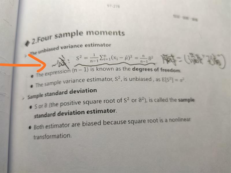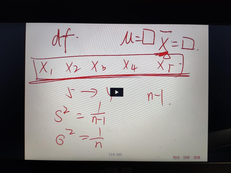 在介绍样本方差公式的所提及的两个版本中,高老师提及到版本二更符合无偏,且用了自由度的理论解释缘由。参考图三,X1, X2, X3, X4, X5这5个值,倘若该5个值就是总体,那么均值μ是个常数,老师表示这里的自由度是5,并说到因为该均值不是随机变量,不会借用到X1~X5的自由度。但个人感觉这里的解释有点抽象......个人感觉这里总体的自由度更像是4,毕竟均值是确定的常数,X1~X5能自由取值的量只有4个,如果5个都自由取值的话均值不会是确定的。请问我这里的理解哪里出了问题??