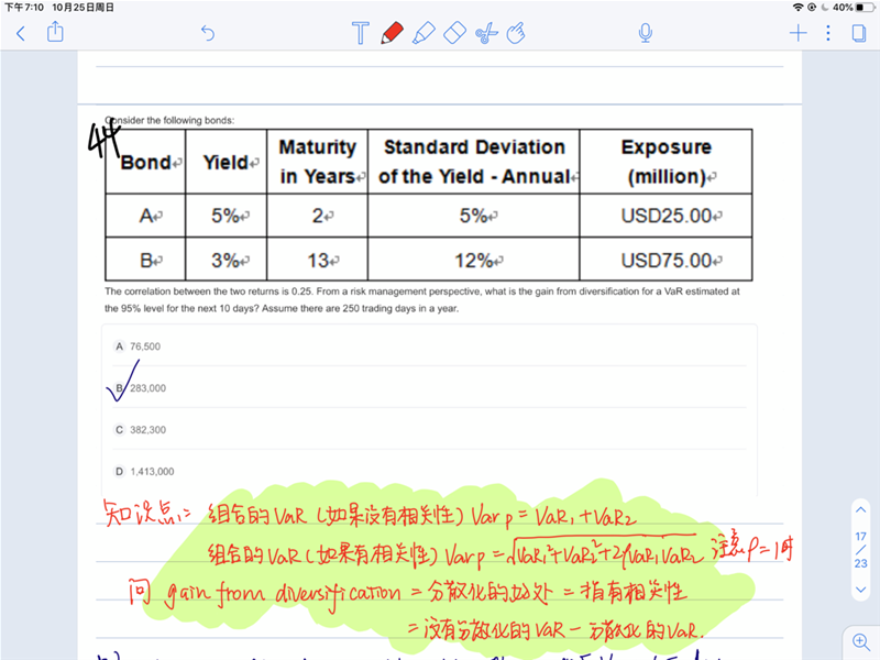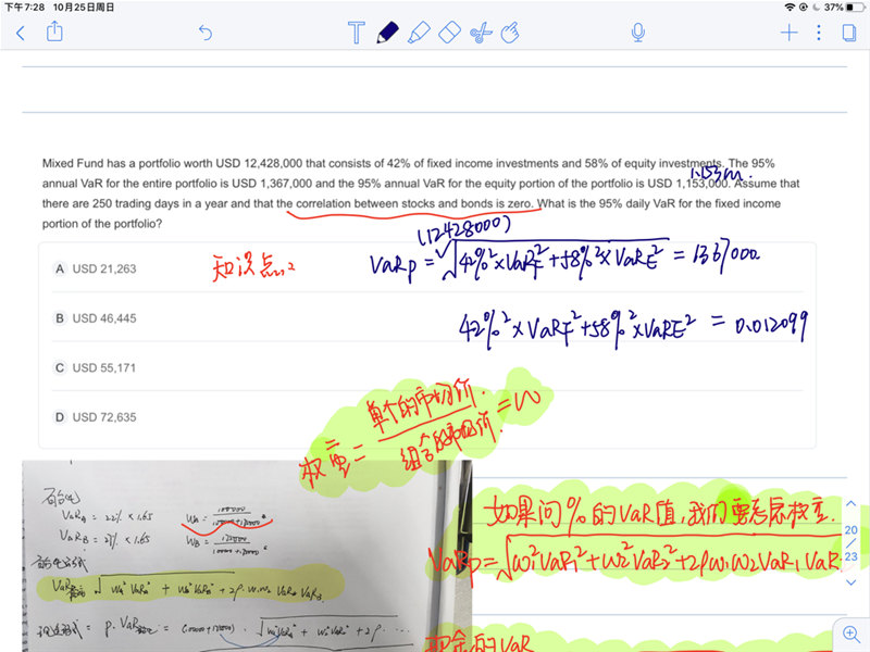 老师您好,讲题老师在讲(见附图)这个题的时候,说如果如果没有相关性的话,直接把他们两个相加就等于组合的VAR值了呢,这个题相关系数也等于0,为什么这边要用平方相加呀