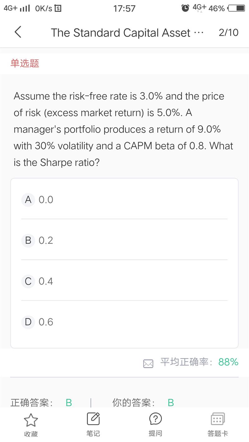 组合的收益是9%,而按照CAPM模型,根据题目条件应该=无风险利率3%+β0.8×市场超额收益率5%=7%,这是题目出的有问题呢?还是我理解那里不对啊?谢谢