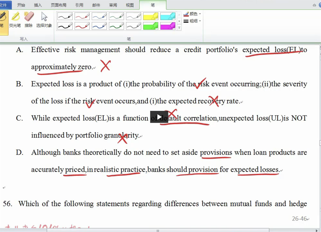 55题,c和d选项什么意思?c选项,什么叫分散而没有分散的效果,选项说ul对组合的颗粒度有影响,组合分散,颗粒度大,非预期损失小?d选项,为什么利率上升其实是拨备呢?