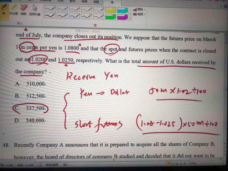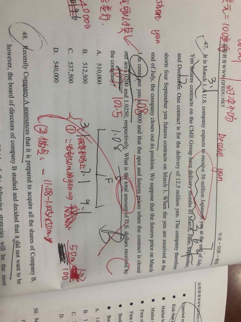 请问老师第47题关于对冲那里的现金流怎么算的,为什么不能用3月份签订的F和到期的现货汇率作差,而是用到期期货的汇率作差,并且差完之后他应该是一个以日元计价的Profit,还需要转化成USD吧?老师这个式子对吗