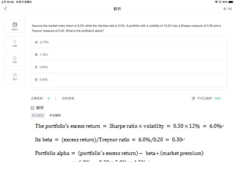 Sharp和treynor用的是理论收益计算还是实际收益?还是都可以?alpha应该是实际收益➖理论收益,那在这题里,Sharp和treynor就默认用的是实际收益计算的吗