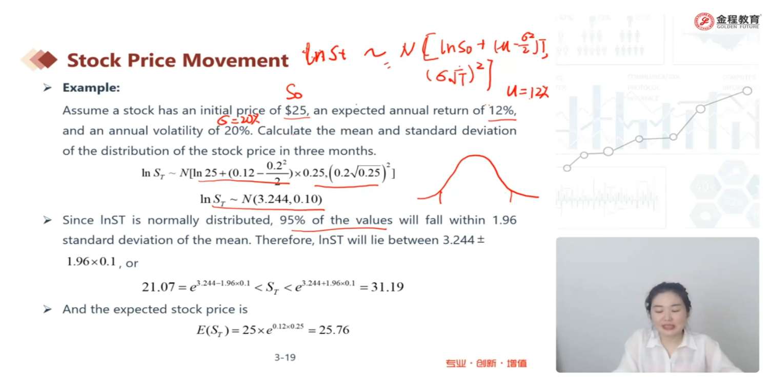 这里expected annual return 和前一页PPT中Expected return on stock per year一样吗,都是指μ吗,那lnS0+(μ-1/2σ^2)T是什么,按题目意思这是股票价格分布的均值?lnSt不是代表return吗,完全没搞明白这几个的含义,听这老师的课太费劲了,重要的还都是她讲的。。。