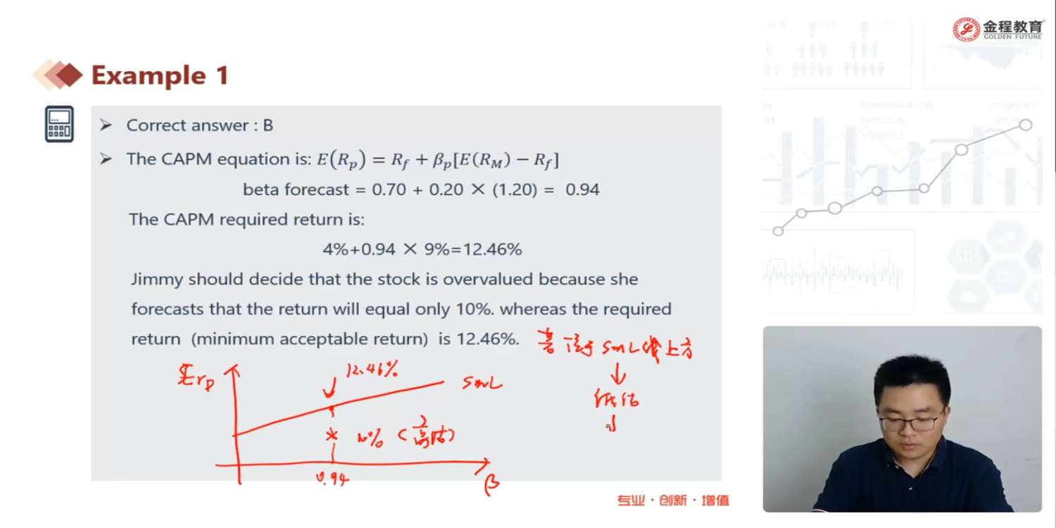 为什么 市场回报率低于CAPM的回报率,是高估?承担了相应的风险,但是没有给到相应的回报,是说定价偏高了吗?所以说这个资产被高估了