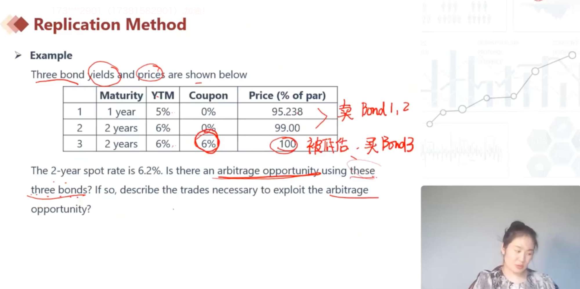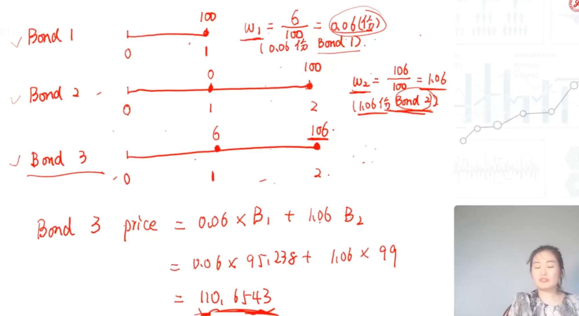 第一个问题,请问老师如何确定到期bond1和2的现金流是100流入的呢?price of par 是面值,也就是说95.238,99是现价,95.238*(1+5%)=100,但是99这个两年期的如何计算得到现金流入也是100的呢?第二个问题,请问最后bond1+2得到bond3后,得到的bond3的价格是面额对吗?100是它的市场价,所以市场价格比面额小,该债券被低估了?应该买入bond3?