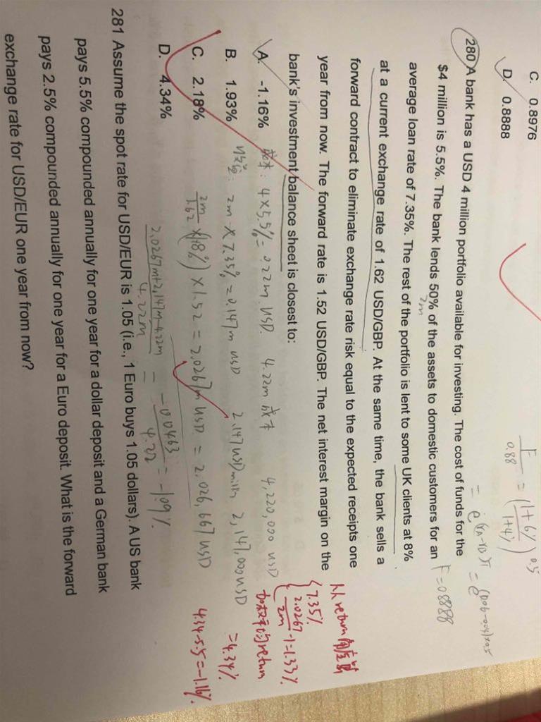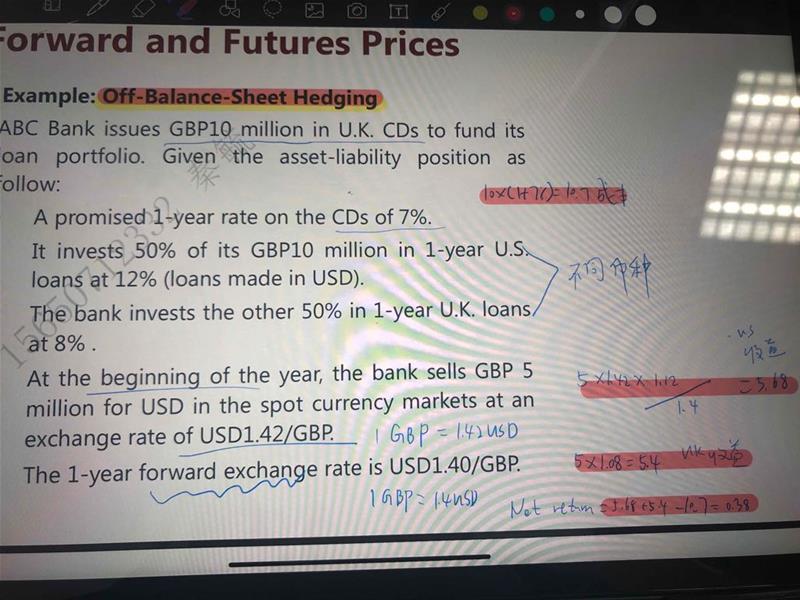 老师,280这道题,铅笔我是按照成本和收益一步一步算的,把收益加起来减去成本除以原成本算出return,但是答案是分别算return。我们基础班讲义给的算net return的例题就是按照我铅笔的方法算的。所以应该哪种是对的呢?还有题干问on the balance sheet,这个是指表内对冲吗?表内对冲需要看asset和liability,但是我没找到数据…所以我就按表外对冲来计算了,请问这个影响吗?