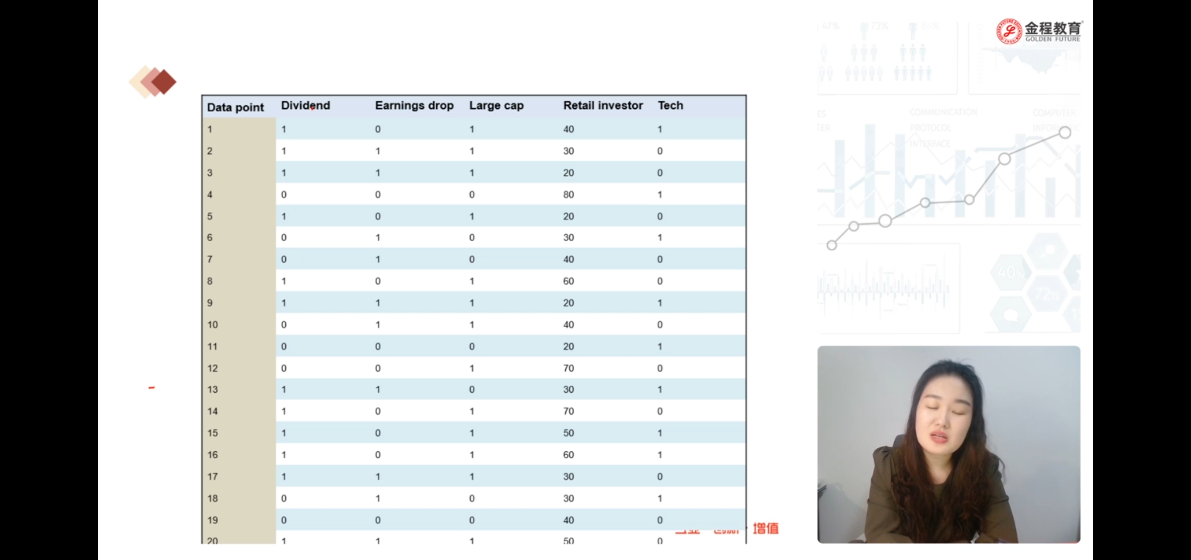 老师在这里说个人投资者占比这个数据的时候,说这个数据和其他几个类型的数据不同,稍后再来讲,结果课件看完了,老师也没有回来讲解这个零售投资者占比这类数据要怎么处理(相对于其他类别数据都是0,1的时候,应该怎么处理这里普通的数字数据)。请补充讲解一下。另外,课件录完是不是可以检查一下,没有讲到的知识点,口误或者笔误的地方,还有很多地方剪辑把其中一段减掉了,导致视频出现断层,我花这么多钱购买课程,就应该在视频质量上有最基本的保证才可以。