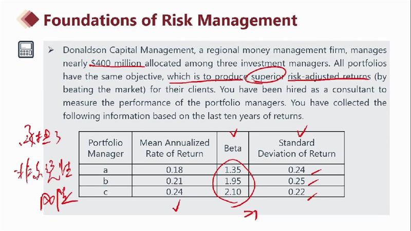 这个题可不可以这样想,第二个比第三个的β小,但收益的标准差却大,说明有非系统性风险。所以要用衡量总风险的指标。