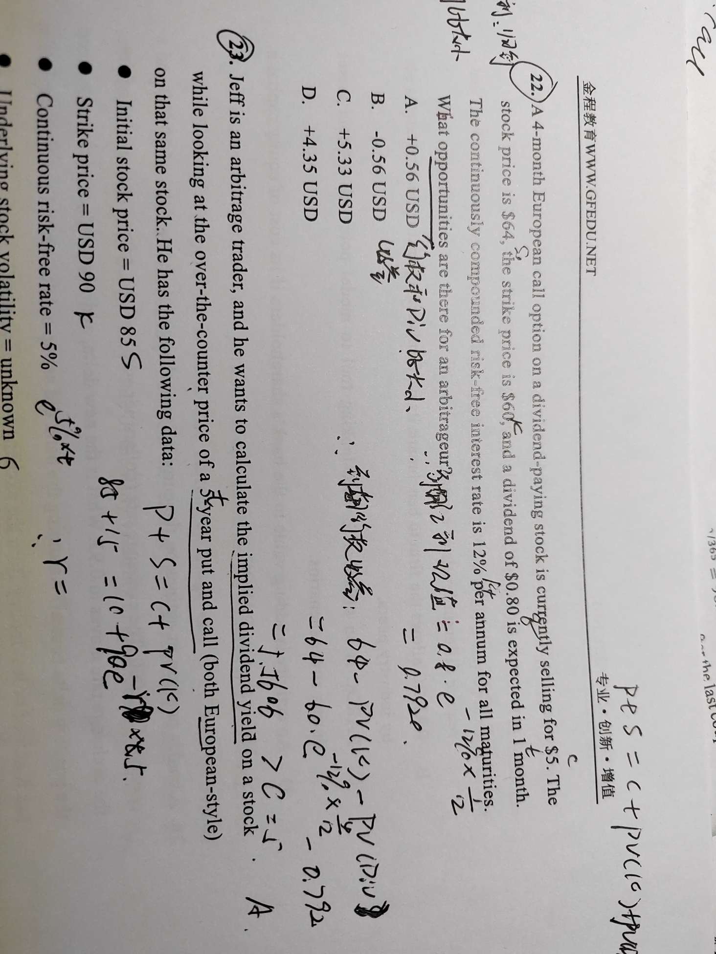 老师,这道题我觉得应该是用右上角我写的那个期权平价公式吧?但是为啥P被忽略不计了呢?😔