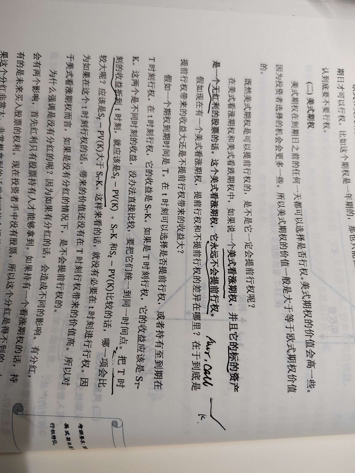 老师,关于美式期权在没有红利时不会提前行权的解释,划线这句话我觉得不对,t和T时刻不可比的是市价,不是执行价格k,所以要两个时点的收益可比,应该是把ST折现到t时刻,不是把k折现呢?请老师确认
