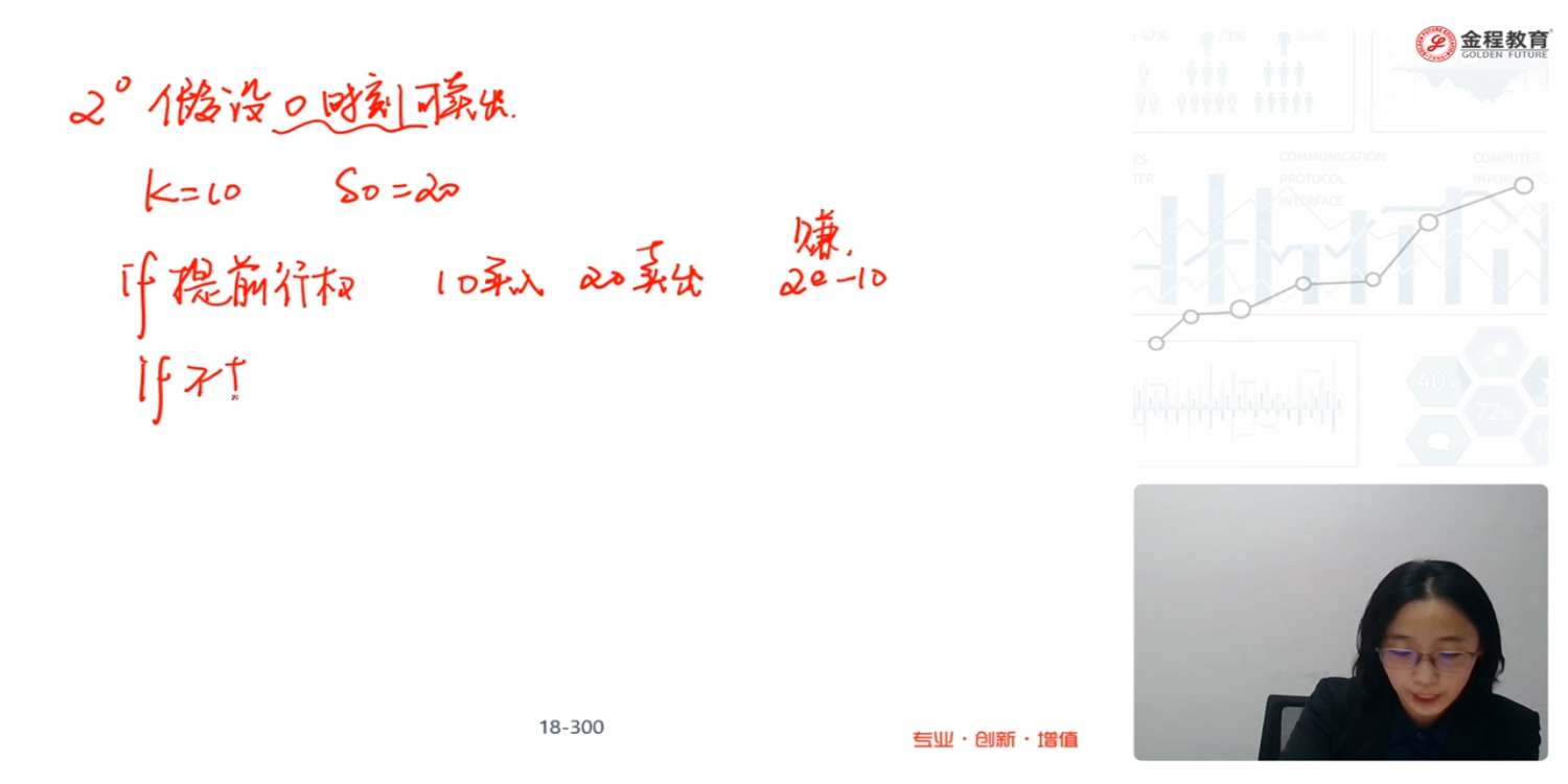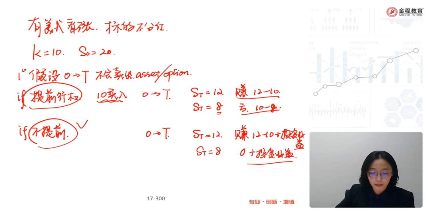 这里没看懂,请老师再讲下这个部分的逻辑,这里K=10意味着执行价是以10元买入,那价格在20元,我提前行权不是赚了10元吗,为什么要等到到期时点,股价是波动的,到期时点股价可能下跌呀