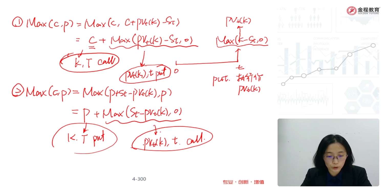 请问Max(C,P),是从什么时刻来看的?如果是t时刻,那么就是Max(Ct,Pt),然后也在t时刻带入期权平价公式,那么一切都是t时点的,这样按照这页PPT上半部分老师的方式,整理完后,提出来的C就应该是Ct,可为什么PPT上写K,T Call呢?时间明显不对呀。