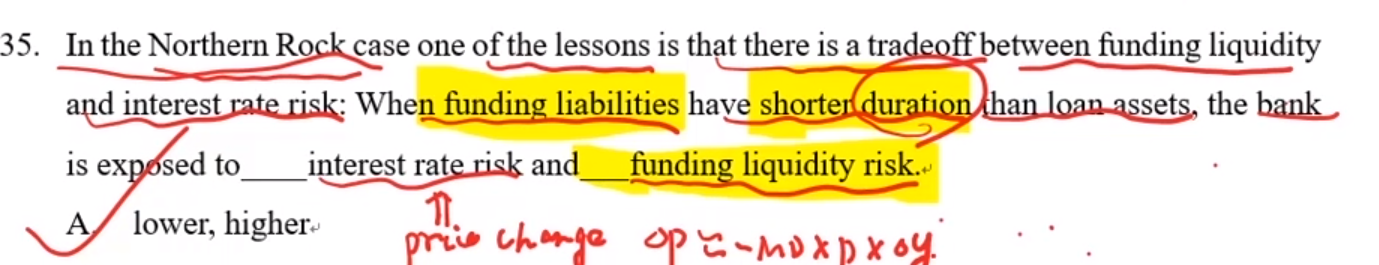 这题能讲下funding liabilities和loan assets的区别吗?为什么前者久期小,就能使得银行利率风险降低?