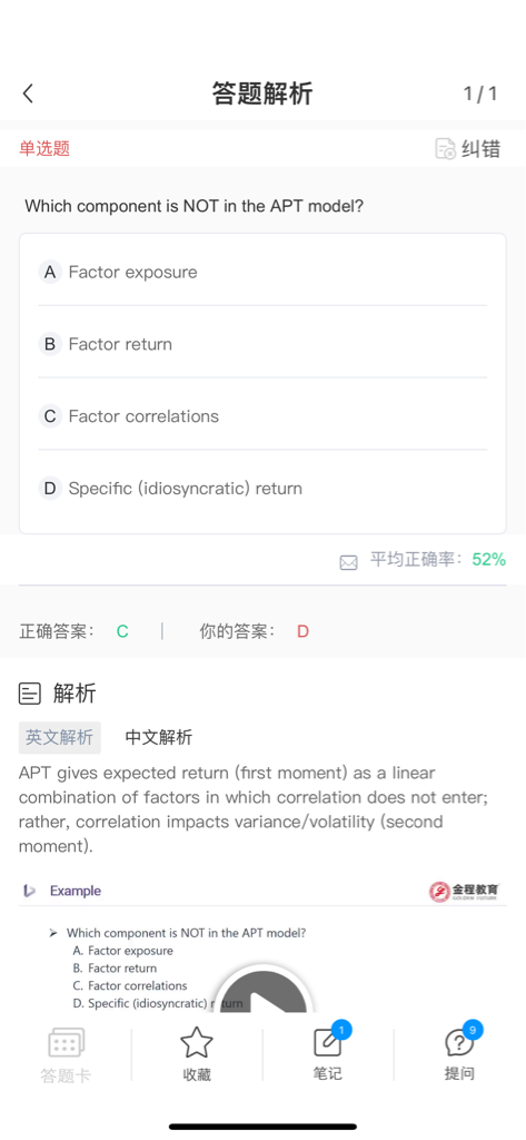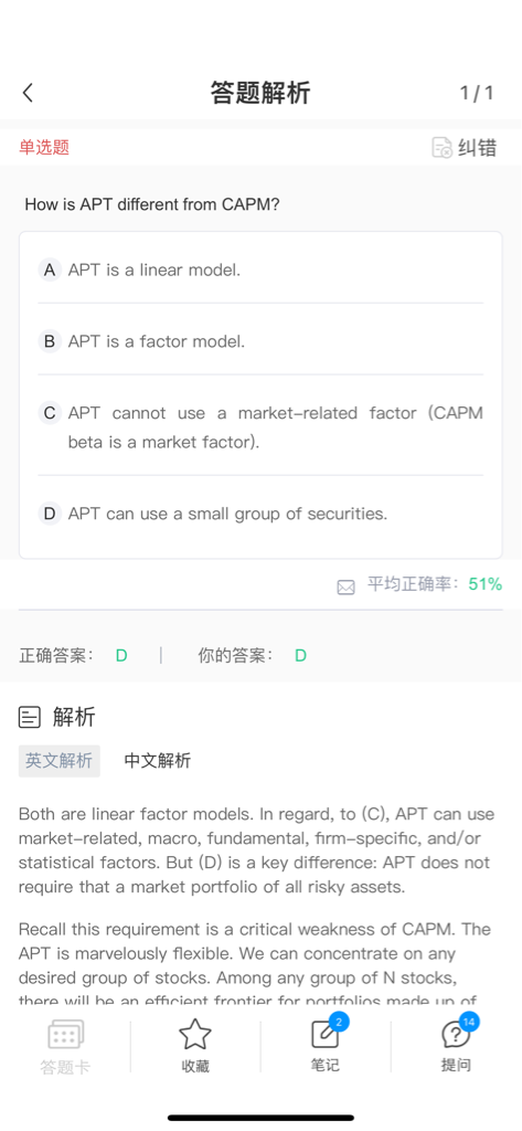 A选项中听老师讲解的意思是CAPM模型用的,不能做APT的风险因子,但两者difference这题不是说可以用CAPM的market factor作为APT的风险测度么?