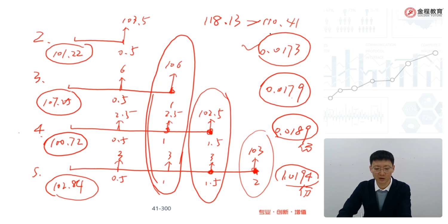 老师,这个是不是算错了,101.22*0.0173=1.7511,107.25*0.0179=1.9198,100.72*0.0189=1.9036,102.84*1.0194=104.8351,这四个和加累加等于110.41,和Bond1相等,没有套利机会呢,我算了好几遍,都没有得出118.13,麻烦您帮我看下哪里错了?