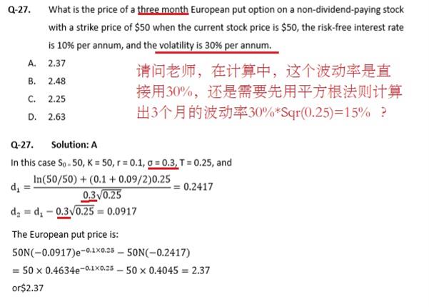 估值与风险模型百题Q-27,题中给出了年波动率为30%,在用二叉树或BSM模型计算时,是不是需要先用平法跟法则把波动率转换成三个月的?