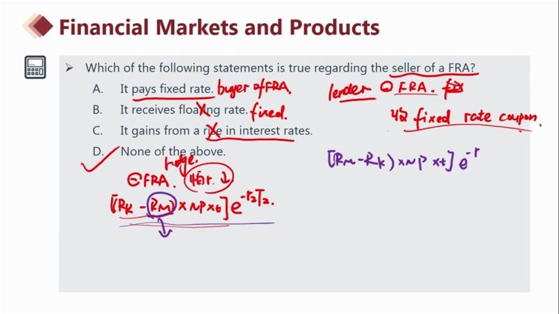 能解释一下这两道题的不同吗,为什么第一道题是卖方是收到固定利率,但是第二道题又说是浮动利率,签订了FRA之后,双方不应该是按照合同固定利率交易吗,那为什么第二道题的C选项不对呢
