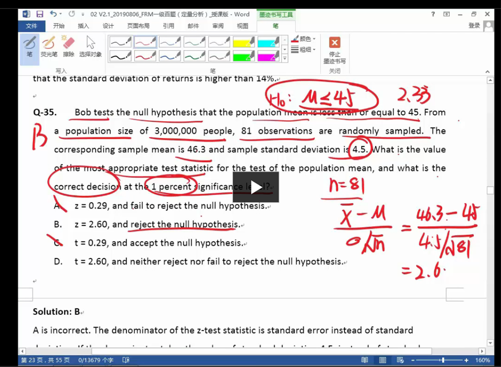 老师好!请问Q35中,1.单尾的2.33是要记住的吗?除此之外,单尾的其他数据还要记住哪些?2.在Q34题,得出的数据是Higher的,是不拒绝的;而在Q35题,得出的数据也是Higher,但是是拒绝的。请问能说一下对于分别单尾和双尾,什么情况下拒绝,什么时候不拒绝吗?谢谢!