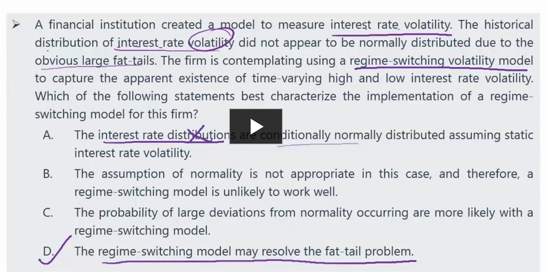 老师,我没有明白这道题的A选项,利率分布不服从正态分布而是服从条件正态分布,因为利率一般为正,A怎么错了呢?