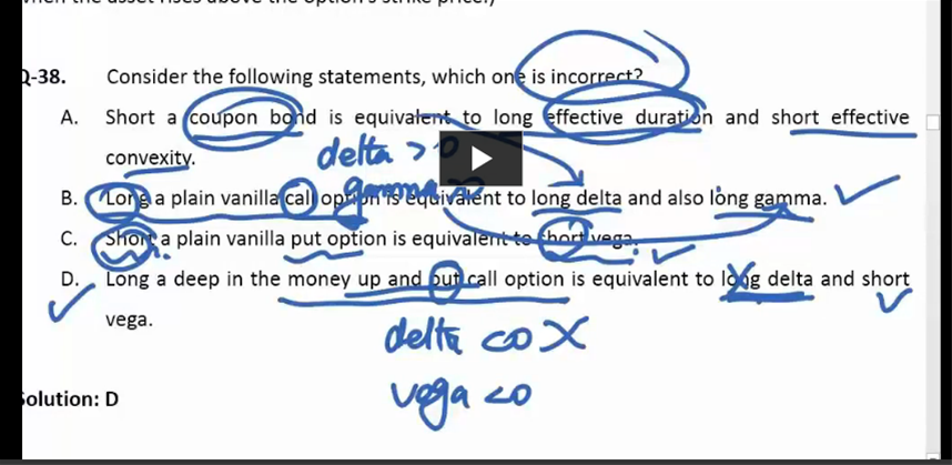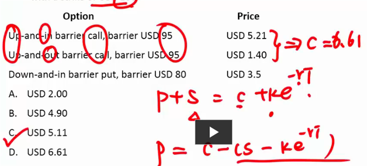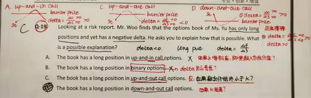 老师您好,关于这道题有如下疑问:1. 不需要考虑strike price和barrier price的大小关系吗?比如C选项,如果strike price非常高,那么原先期权价值为0,敲出之后期权价值还是为0?delta可能等于0? 2. B选项中binary option的delta怎么考虑?我认为是等于0?