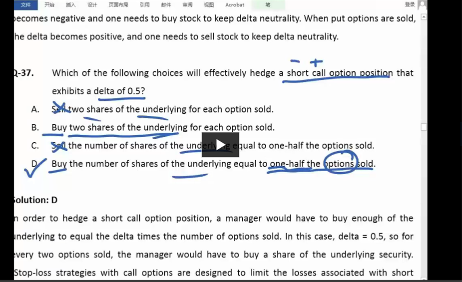 老师 请问 这里D是怎么理解的?应该是买0.5份标的资产。不知道 equal to one-half the options sold是如何理解?为什么对冲delta要用 option?而且为什么是sold?
