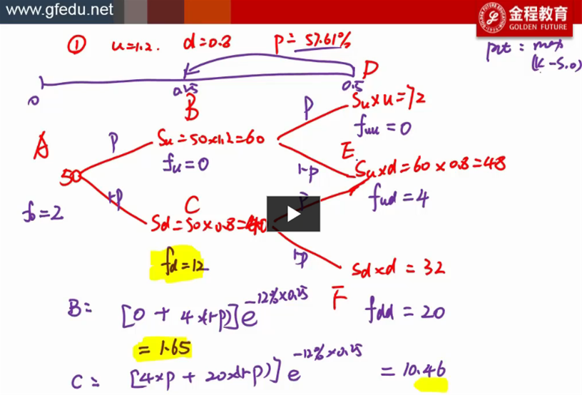 老师 我有一个关于美式期权计算价值取各个点最大值再贴现的小问题。如图。c点是12 所以不用第二期贴现过来更小的10.46。B点用第二期贴现过来的1.65 不是B点行权的话是价值0。请问如果是真实行权中,应该在0.25的时间点行权 还是0.5行权呢?(感觉哪个点都有value的可取之处 所以比较疑惑)