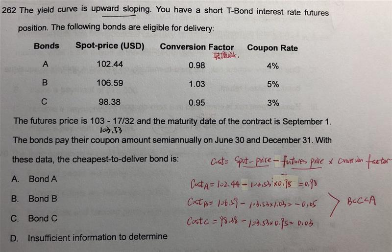 - 我怎么感觉这题不太对呢。特别是C/D两个,都是需要股价上去才可能有利,所以逻辑是一样啊,都是做高业绩,但是C反正都遥遥无期,动力没那么足吧。B现在是平值,就差那一把火就能盈利了所以应该最要努力把业绩做起来吧?A也是,你既然都深度实值了,赶紧卖了得了,还做什么风险管理。这题我都不懂