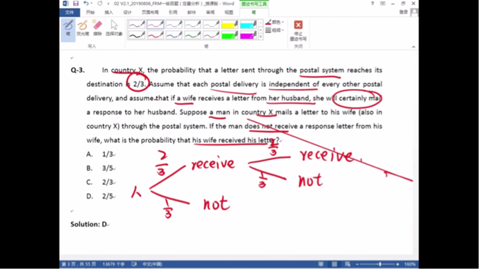 请问老师,题目中说:如果妻子收到了来信,she will certainly mail,意思不是妻子只要收到来信就一定会给丈夫回复吗,怎么还是2/3的概率呢?