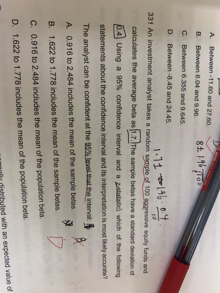 老师这道题目我有几个不明的地方 第一个:confidence interval 是均值加减critical value个标准差嘛。 然后哪个标准差又等于“标准差”➗根号N。 这两个都是标准差要怎么区别啊 要怎么区分呢。 第二个:332题中他说standard deviatetion是等于25 但是题目又没有给到N值 题目直接把他当成了总的标准差。 对比329题 题目也提到了 standard deviation 等于8.5 但是这里却要➗一个根号n也是说329题把他当成了分子上的标准差。为什么会这样呢 ? 第三个问题 :332题解出了两个critical value后为什么要把它们想减 题目问的是啥意思啊。 麻烦老师了。问题有点多