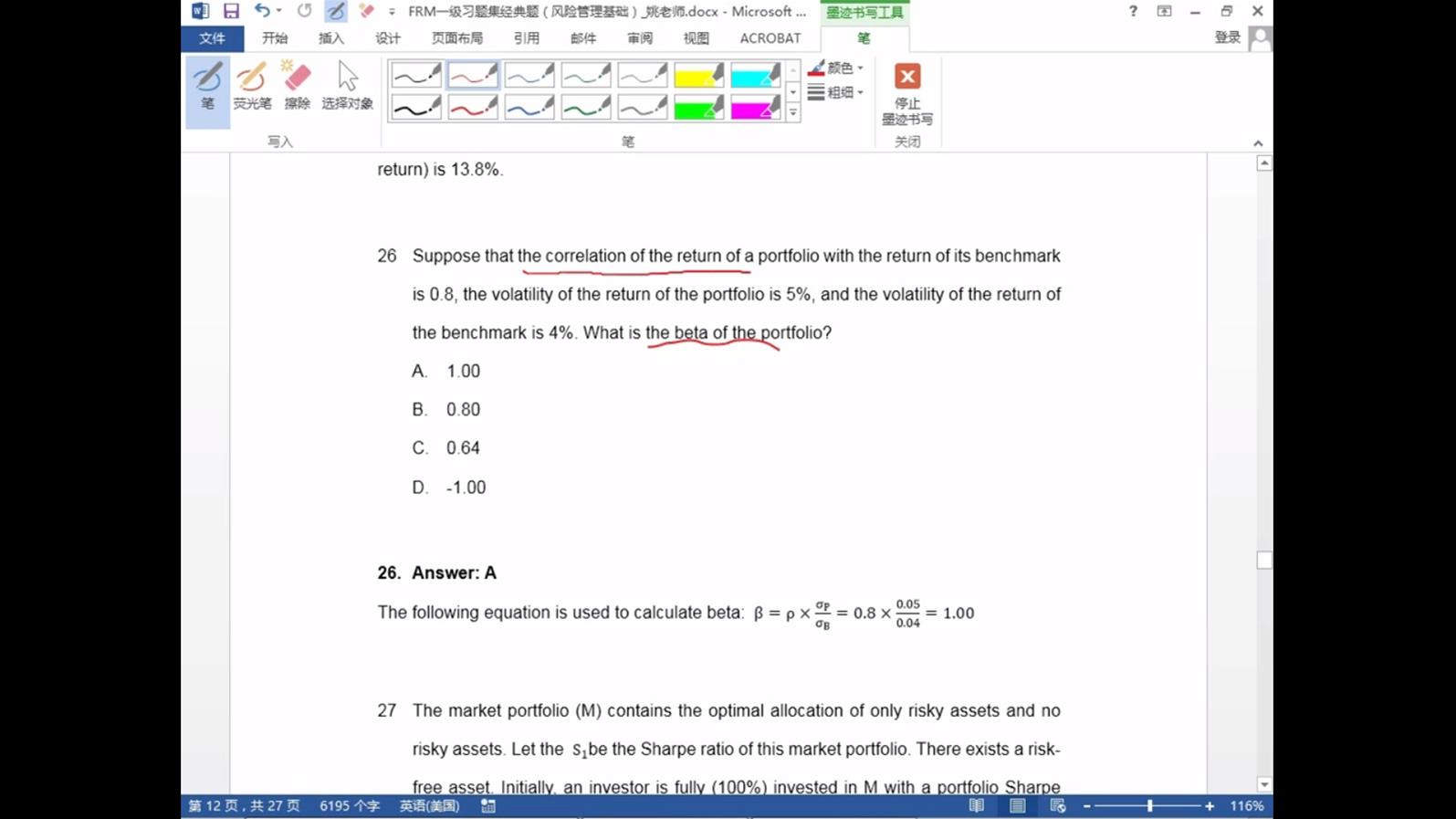 老师,我一直有个疑问,可能和做题没啥关系。 这个CML他的横坐标代表的是总风险,但CML线上的所有点,都是已经充分分散化了,它们到y轴的距离就是系统性风险,也就是横坐标是系统风险,但是大前提横坐标是总风险啊,这不矛盾了吗。能理解我的疑惑点吗。 我举个例子,比如(1,2)在CML线上,当总风险为1,只有收益率为2的时候,这个总风险1就是自动转换为系统性风险1。 但是这么理解就有一个问题,算夏普比率的时候,分母是总风险,但cml线上点风险充分分散化了,也就是除以的是“已经充分分散化的总风险”,那不就等于除以系统性风险吗。这不就是特雷诺比率了吗。 一开始还还明白了,现在反复想就越来越乱。。