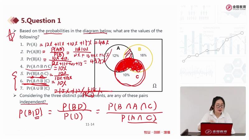 老师,在这个例子里面,如果A,B,C 三个都是独立的,那么P(ABC)=P(A)P(B)P(C),在图形上是怎么显示的呢?这里A,B,C 不是相互独立,所以可以用三个的交集10%;那么如果是相互独立,用图形怎么算,这个实在没想出来……
