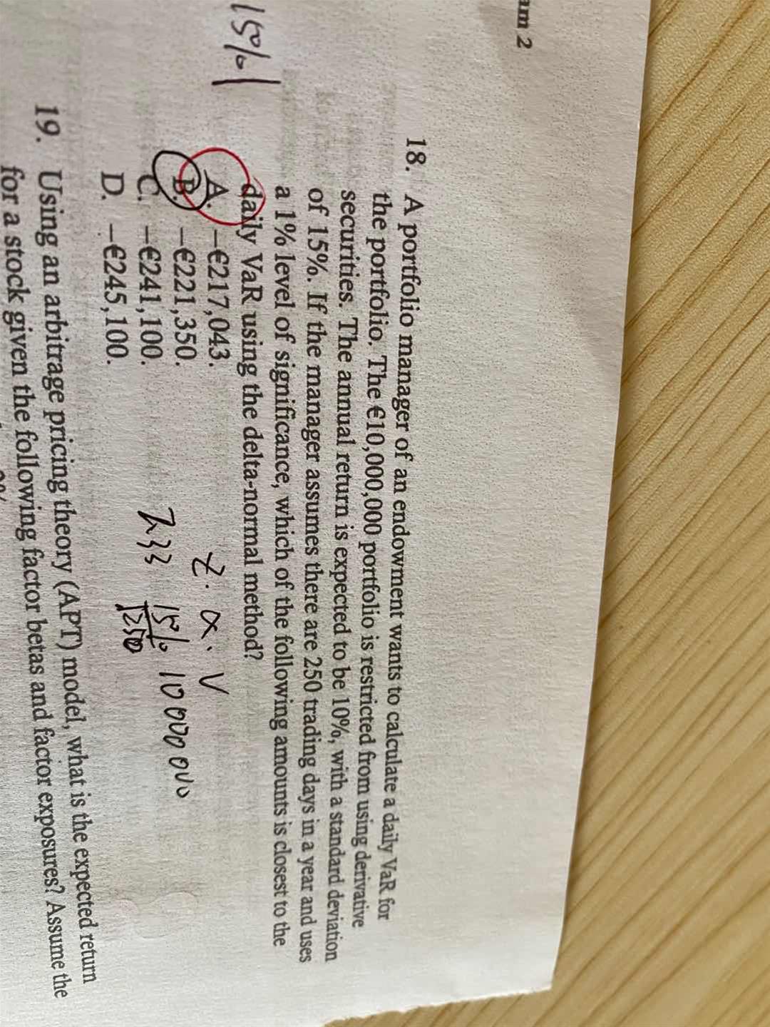 请问这道题用E(R)-Z*SD之后我算完annualized var之后该怎么算呢